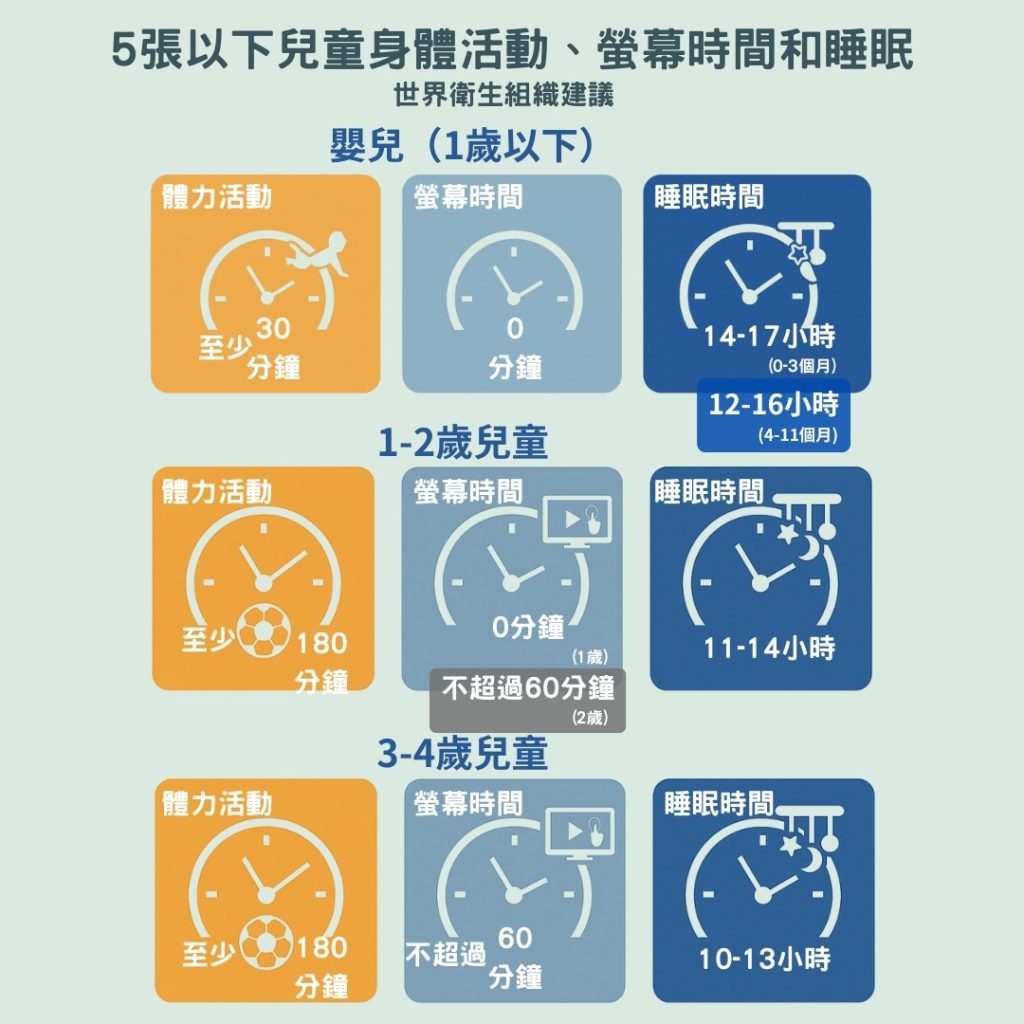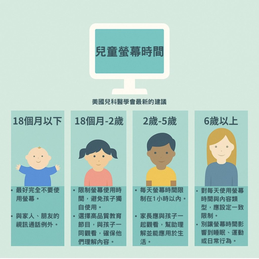 2. 兒童規範:一歲以下不得接觸螢幕;一到五歲每天不超過一小時。